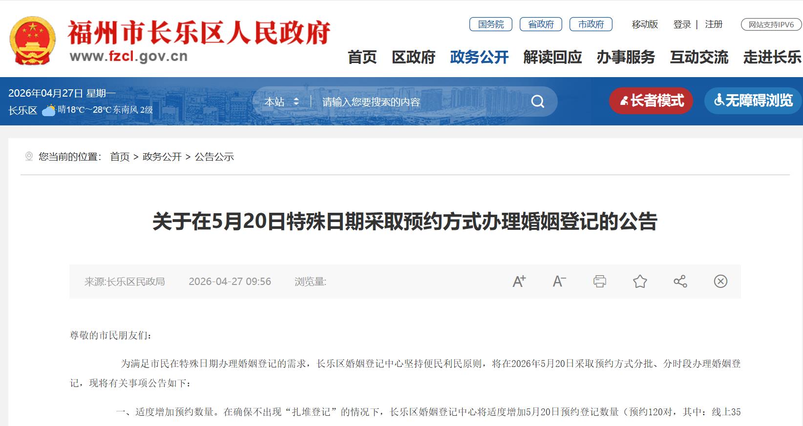 2026年4月27日,福州市长乐区民政局发布“关于在5月20日特殊日期采取预约方式办理婚姻登记的公告”。