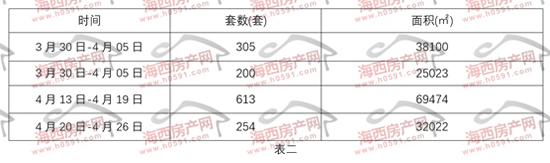 表二为2026年3月30日-4月26日福州下辖七县(市)区住宅签约明细表。上周福州七县(市)区住宅签约254套,环比前一周减少359套。