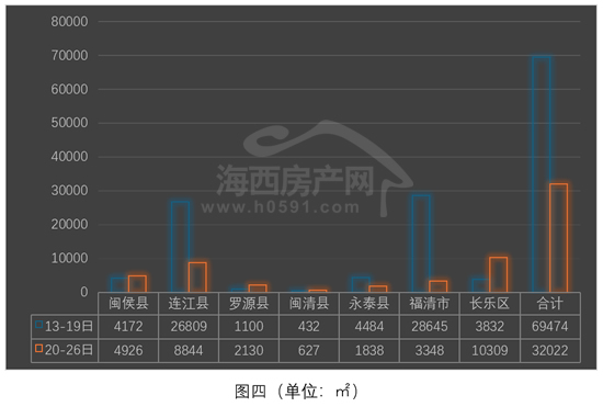图四为2026年福州下辖七县(市)区住宅面积对比图。上周福州七县(市)区住宅签约32022㎡,环比前一周减少37452㎡,降幅为53.9%。