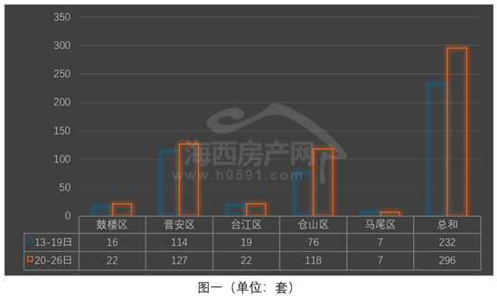 图一为2026年4月13日-26日福州五行政区住宅签约套数对比图。上周福州五行政区住宅签约296套,环比前一周增加64套。