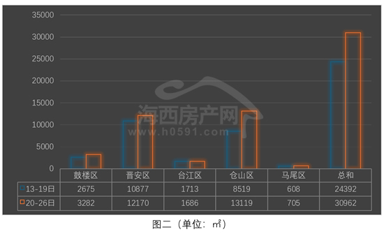 图二为2026年4月13日-26日福州五行政区住宅签约面积对比图。上周福州五行政区住宅签约30962㎡,环比前一周增加6570㎡,增幅为26.93%。