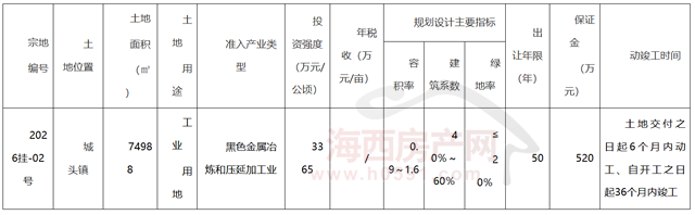出让公告显示,福清2026挂-02号地块位于城头镇,土地用途为工业用地,准入产业类型为黑色金属冶炼和压延加工业。