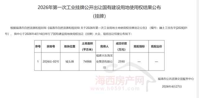 4月27日,福清市公共资源交易服务中心公布“2026年第一次工业挂牌公开出让国有建设用地使用权结果”。