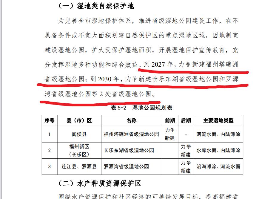 到 2027 年,力争新建福州塔礁洲省级湿地公园;到 2030 年,力争新建长乐东湖省级湿地公园和罗源湾省级湿地公园等 2 处省级湿地公园。
