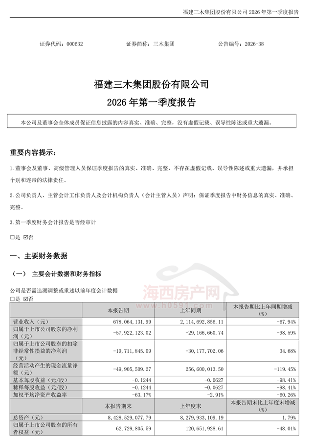 此外,4月29日三木集团还发布2026年一季报。报告显示,公司一季度营业收入为6.78亿元,同比下降67.94%;归母净利润为-5792.21万元,同比下降98.59%;扣非归母净利润为-1971.18万元,同比增长34.68%;基本每股收益-0.12元。