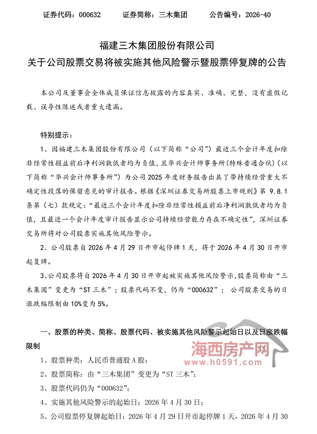 公司股票自2026年4月29日开市起停牌1天,将于2026年4月30日开市起复牌,股票简称由“三木集团”变更为“ST三木”,股票代码不变,日涨跌幅限制由10%变为5%。
