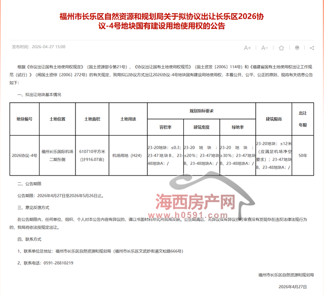 海西房产网(微信公众号:fjhxfcw)消息:2026年4月27日,福州市长乐区自然资源和规划局发布“关于拟协议出让长乐区2026协议-4号地块国有建设用地使用权的公告”。