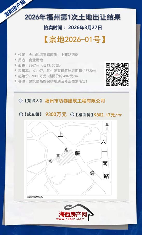 2026年3月27日,福州举行了今年第一次土拍活动。其中,福州市坊巷建筑工程有限公司以底价9300万元竞得宗地2026-01号,楼面地价约9802元/平方米。
