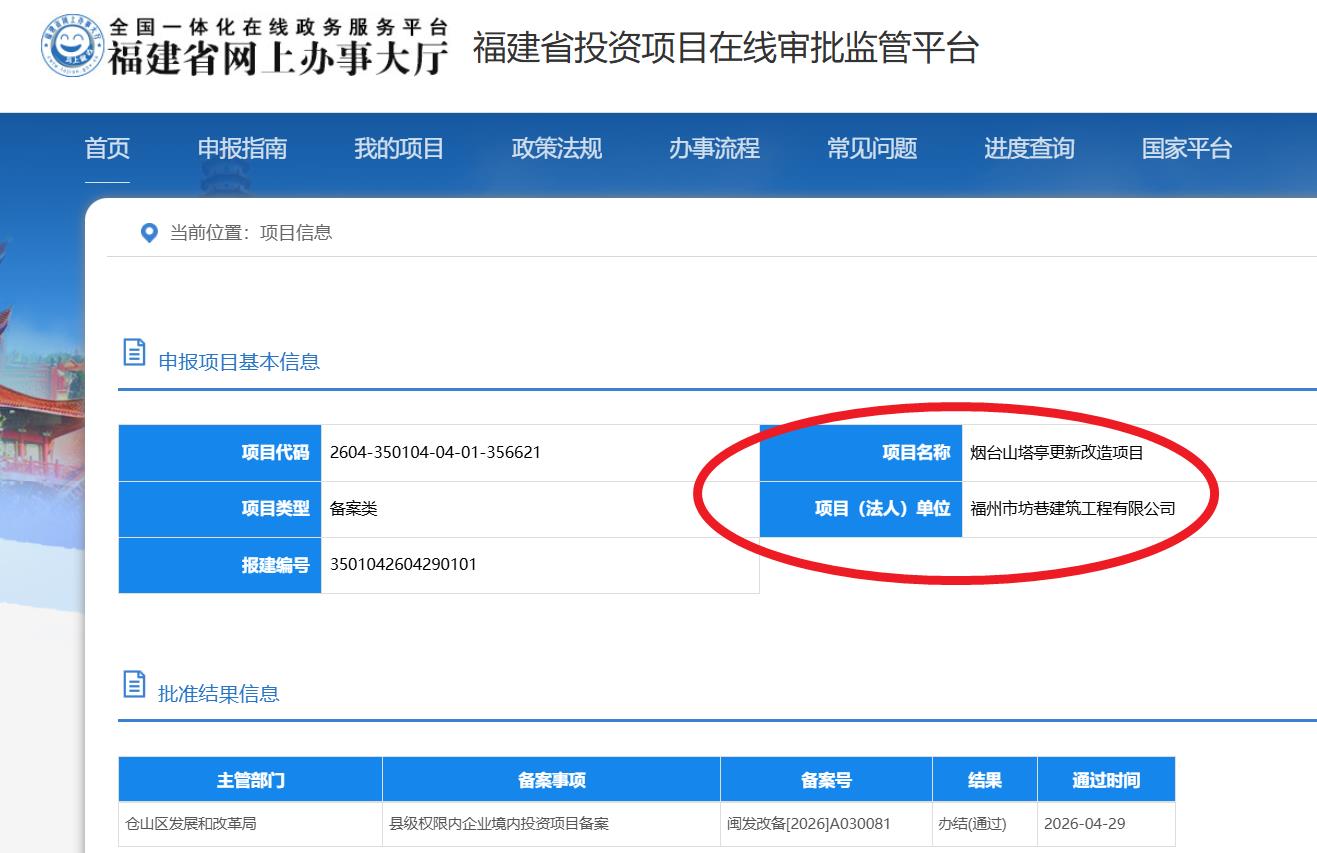海西房产网(微信公众号:fjhxfcw)消息:福建省投资项目在线审批监管平台发布信息显示,“烟台山塔亭更新改造项目”已于2026年4月29日取得县级权限内企业境内投资项目备案,批准结果信息为办结(通过)。