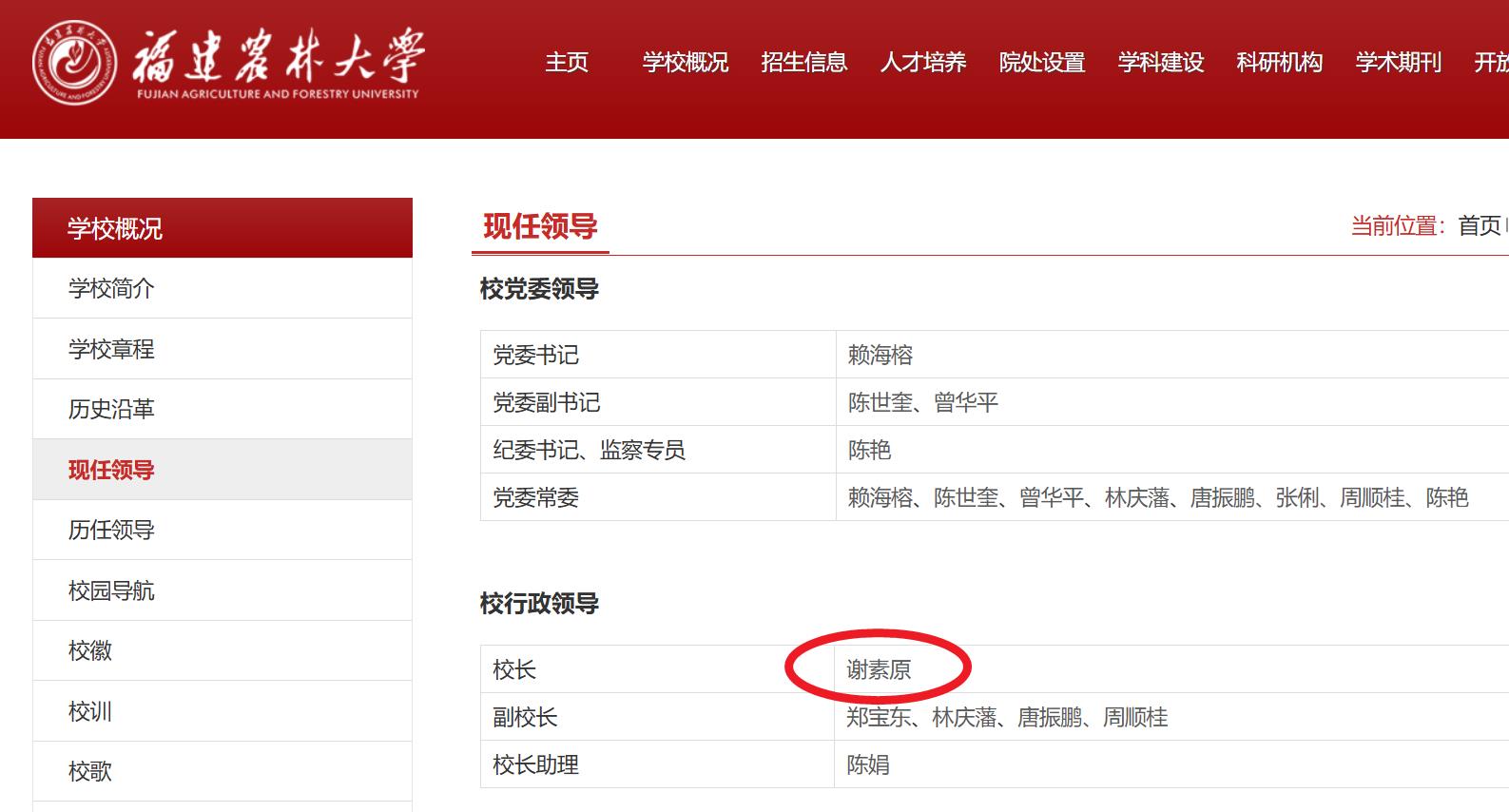 在福建农林大学官网的“现任领导”名单也已更新,校行政领导中,谢素原为校长,副校长为郑宝东、林庆藩、唐振鹏、周顺桂。