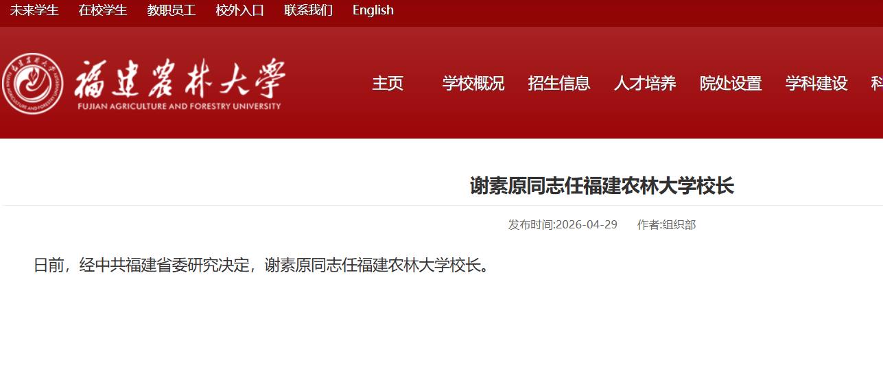 海西房产网(微信公众号:fjhxfcw)消息:2026年4月29日,福建农林大学官网发布消息称,日前,经中共福建省委研究决定,谢素原同志任福建农林大学校长。